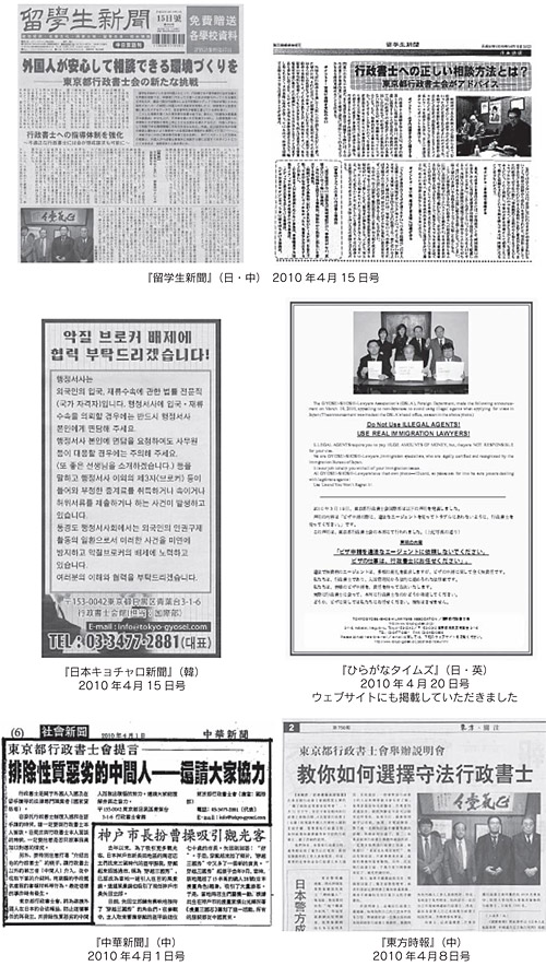 国際部はこの度、外国人向けメディアを通じて声明を発表し、外国語新聞・雑誌の読者である在留外国人に対し、入国・在留手続に関する法律専門職(国家資格者)としての行政書士の存在をアピールし、悪質ブローカーへの注意を促しました。
